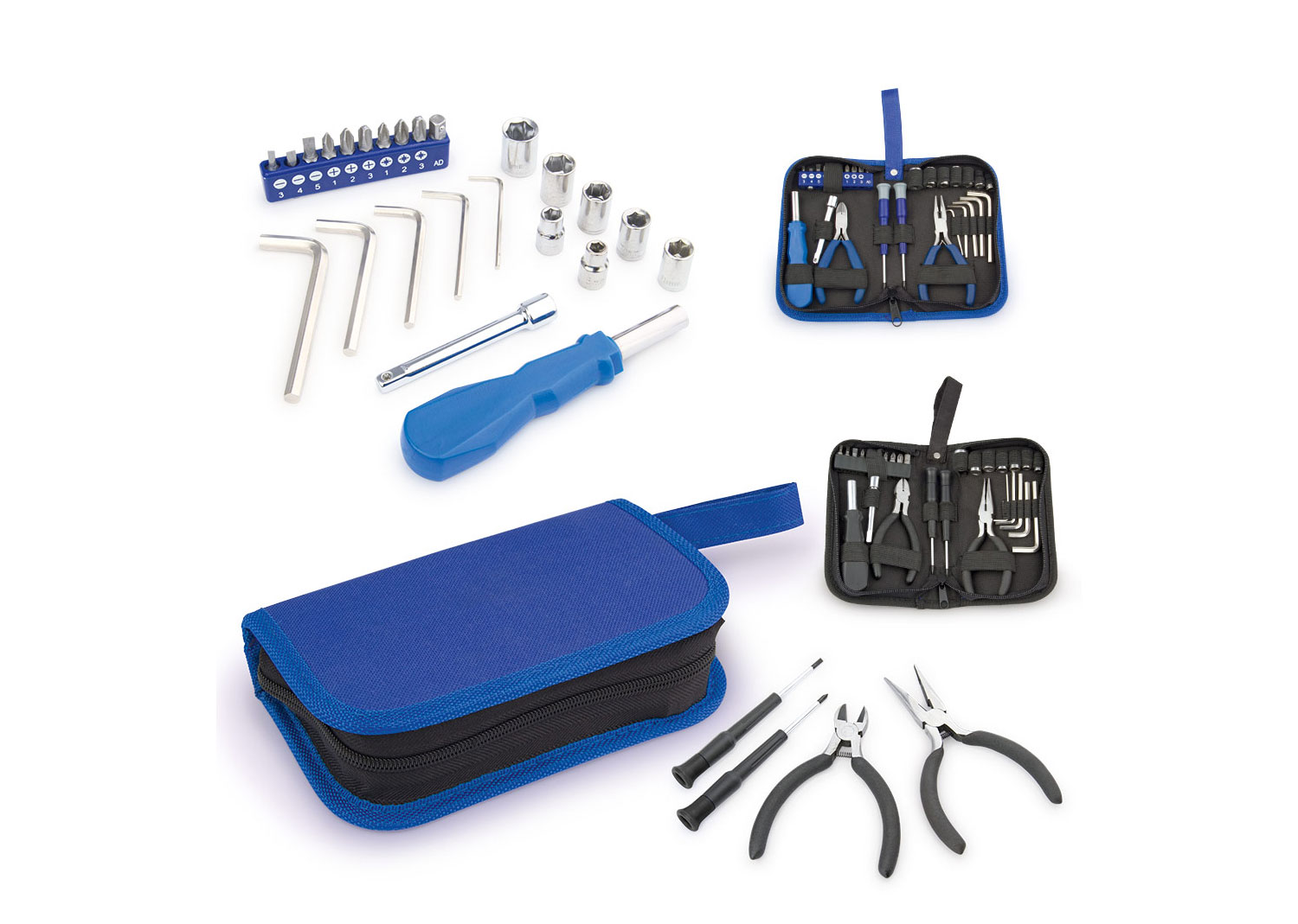 Kit de herramientas que incluye: 1 pinza con cortafrío, 1 cortafrío, 2 destornilladores de precisión, 1 copa de 1/4 x 3″ con soporte magnético, 7 copas de 1/4, 5, 6, 7, 8, 9, 10, 11 mm, 5 llaves allen de 2, 3, 4, 5, 6 mm, 9 puntas de destornillador.