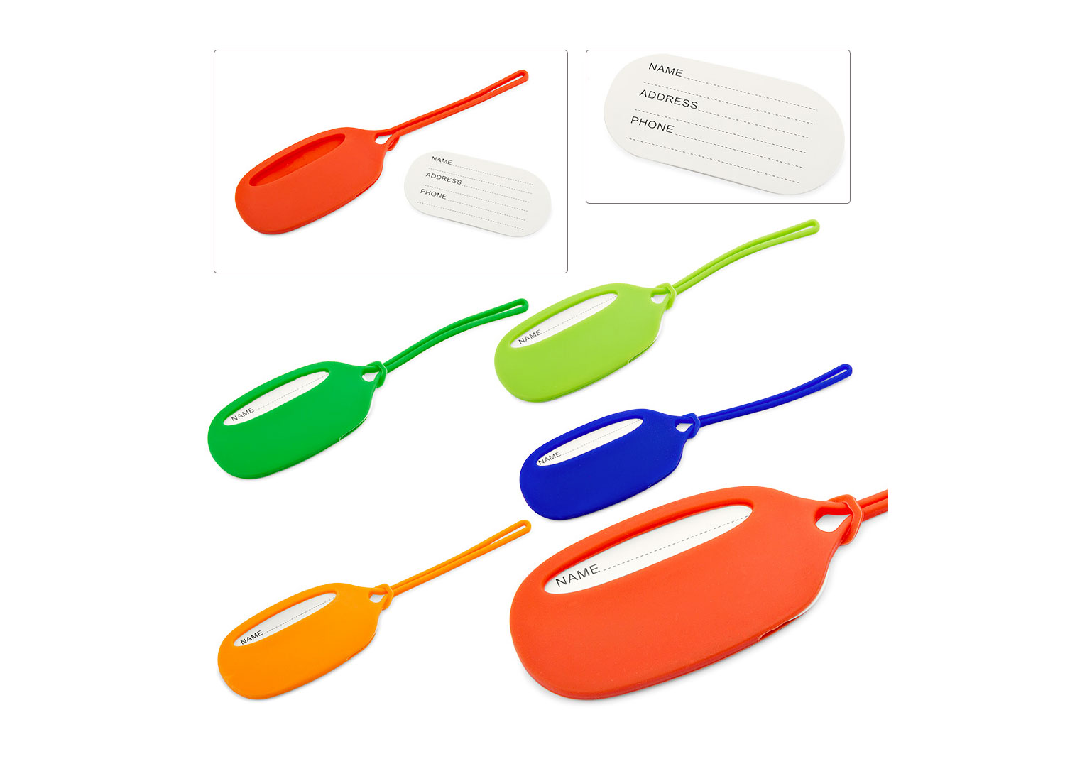 Identificador en silicona para maletas. Incluye cordón sujetador.