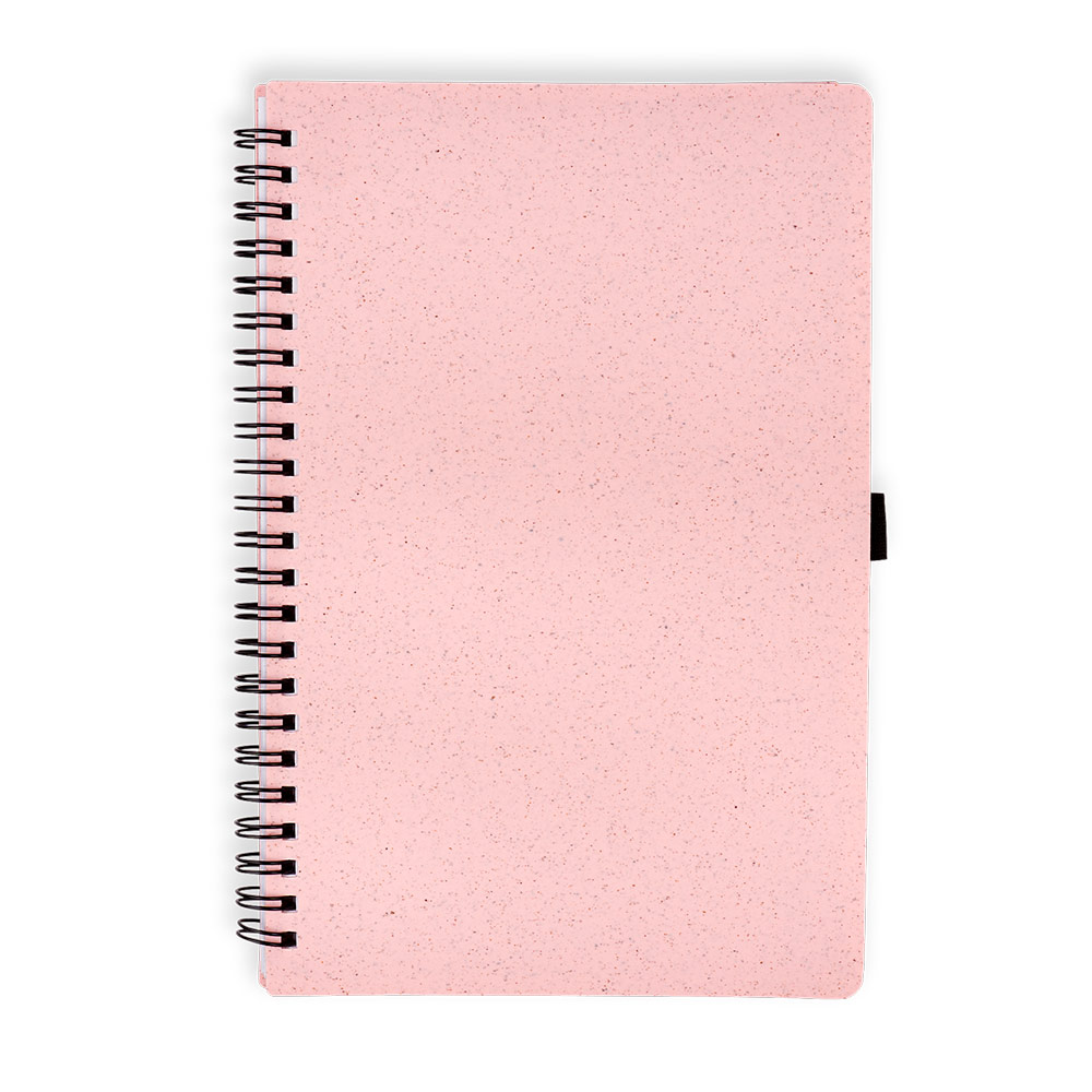Libreta argollada ‘doble O’ con cubierta en paja de trigo. Contiene 70 hojas rayadas de papel reciclado. Tamaño aproximado de la hoja: A5.