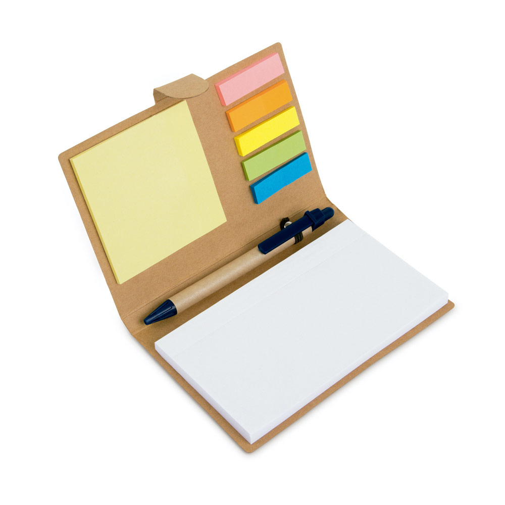 Set de libreta con 70 hojas blancas, 5 juegos de memos adhesivos en papel por 25 unidades c/u. de colores y bolígrafo. Tamaño aproximado: A6. Incluye porta bolígrafo.