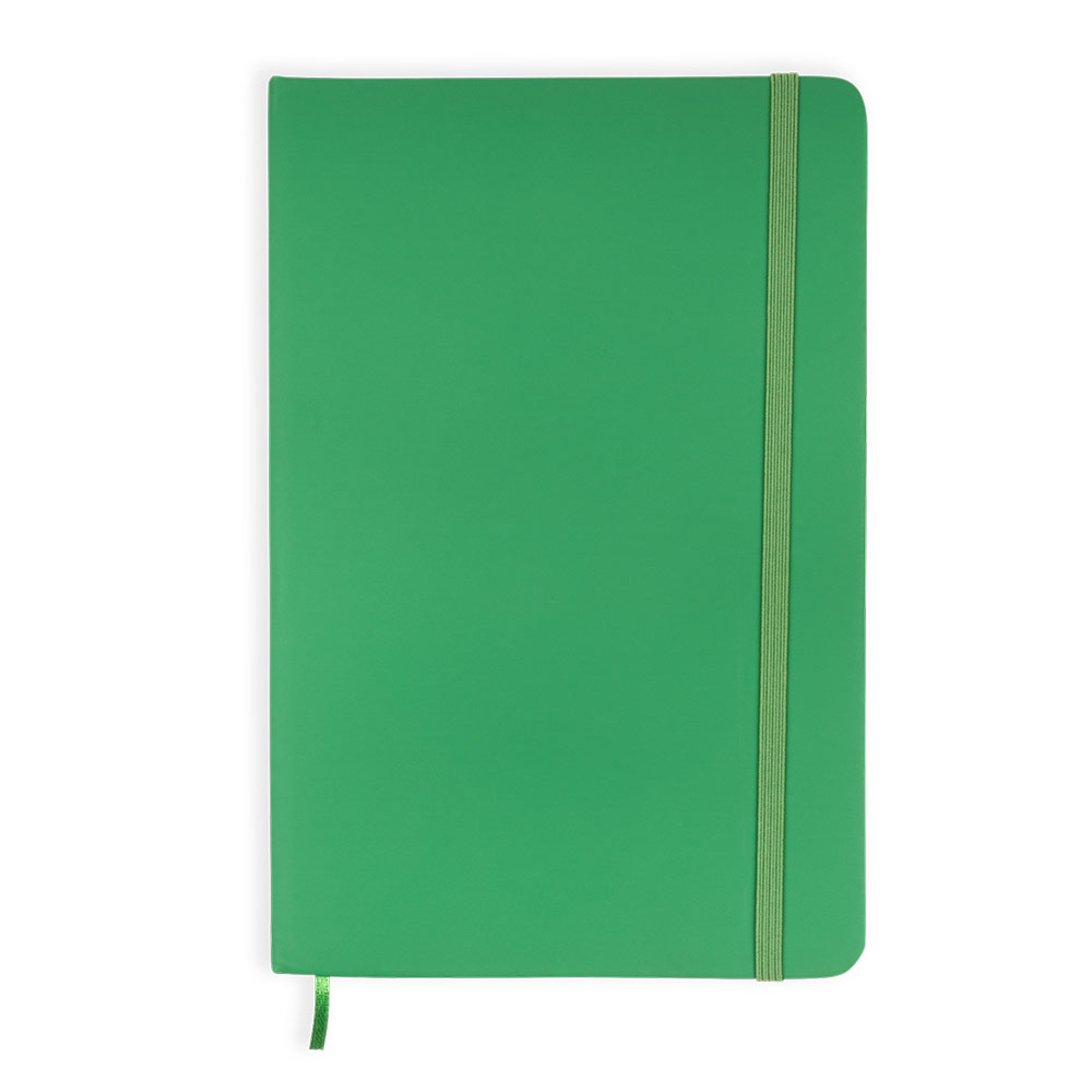 Libreta con cubierta forrada en imitación de cuero. Con banda elástica de cierre y cinta separadora. Contiene 80 hojas cuadriculadas. Tamaño aproximado de la hoja: A5.