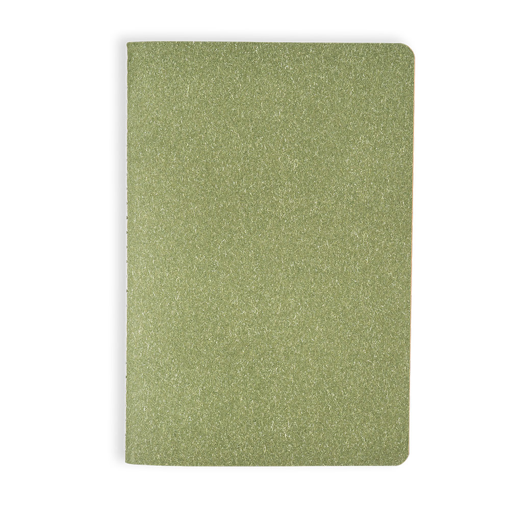 Cuaderno cosido con cubierta en papel esmaltado. Separador de páginas. Contiene 60 hojas rayadas en papel reciclado. Tamaño aproximado de la hoja: A5.