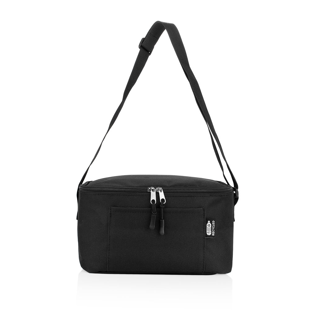 Lonchera con recubrimiento interno, diseño sofisticado, cierre de cremallera con doble deslizador y bolsillo pequeño en la parte frontal. Manija con hebilla para regular el largo del agarre.