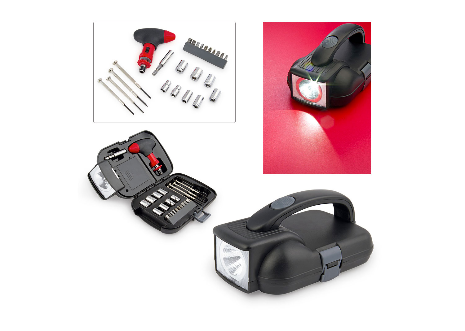 Caja de herramientas con linterna externa (4 pilas AA no incluidas). Incluye ratchet, 8 copas estándar, 10 puntas de destornillador, 4 destornilladores de precisión, un portapuntas magnético.