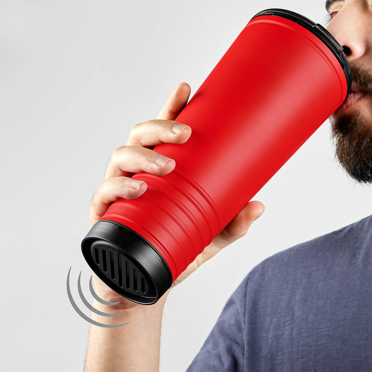 ¡Lleva la emoción de los eventos deportivos al siguiente nivel! Termo equipado con una boquilla especial en la tapa que realiza una doble función; como trompeta, para animar tu evento favorito y al mismo tiempo, disfrutar de tu bebida preferida. Termo doble pared. Pared interna de plástico y externa