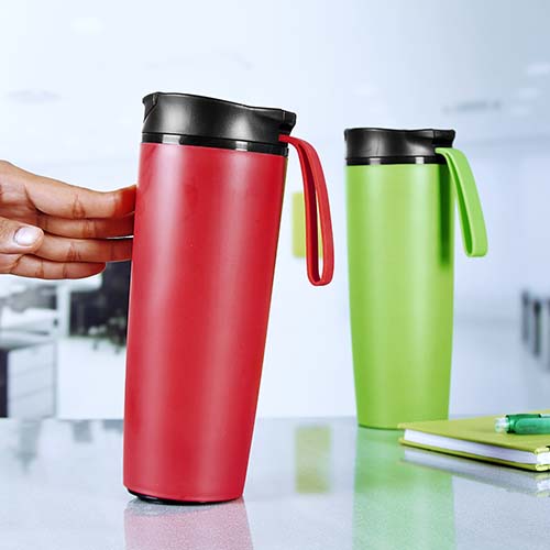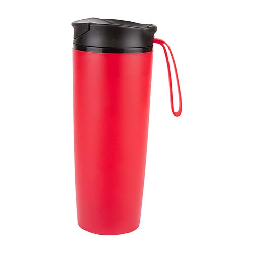Doble pared. Pared interna acero inoxidable, pared externa plástico. Tapa de plástico con boquilla, sobre tapa con cierre a presión y asa de silicón. Chupón de succión en la base que permite la fijación a la superficie evitando el derrame por accidente. Incluye caja individual.