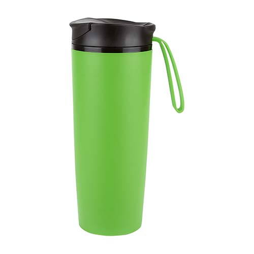 Doble pared. Pared interna acero inoxidable, pared externa plástico. Tapa de plástico con boquilla, sobre tapa con cierre a presión y asa de silicón. Chupón de succión en la base que permite la fijación a la superficie evitando el derrame por accidente. Incluye caja individual.